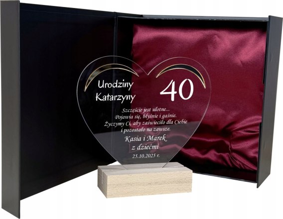 Wyjątkowa statuetka w kształcie serca to idealny sposób, by wyrazić swoje uczucia i stworzyć niezapomnianą pamiątkę na urodziny. Wykonana z połączenia szkła akrylowego i drewna, z dodatkiem złotej lustrzanej plexi, zachwyca elegancją i starannością wykonania.