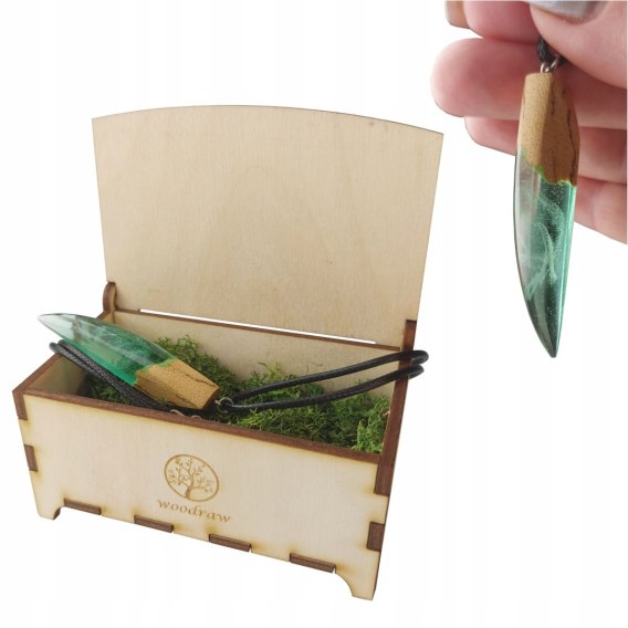 Drewnem użytym do stworzenia tego wisiorka jest egzotyczne drewno zebrano zaimpregnowane naturalnym olejem lnianym. Żywica jest koloru zielonego z białą falą oraz proszkiem luminescencyjnym.