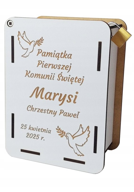 Ta elegancka biała skarbonka to wyjątkowy i praktyczny prezent na Pierwszą Komunię Świętą, który będzie służył przez długie lata. Skarbonka wykonana jest z wysokiej jakości materiałów, a jej personalizowany grawer zawierający grafikę komunijną, imię dziecka oraz datę Komunii, nadaje jej niepowtarzalny charakter. Dodatkowo, skarbonka może zostać wzbogacona o podpis od osoby obdarowującej, co sprawia, że staje się jeszcze bardziej osobistym i cennym upominkiem.