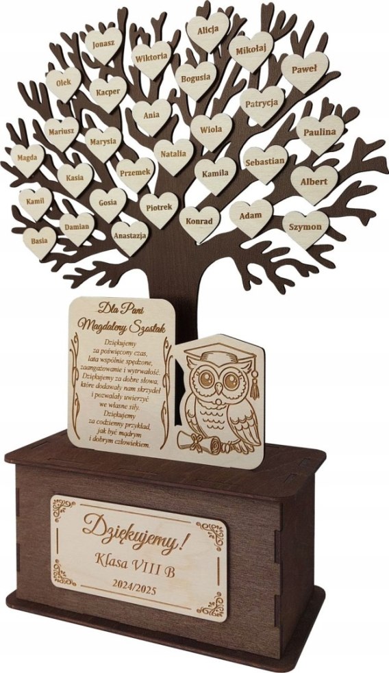 Drzewo symbolizuje rozwój, mądrość i trwałe relacje – dokładnie to, co buduje nauczyciel z uczniami. Każdy element jest precyzyjnie wycięty i ręcznie składany, co czyni ten prezent wyjątkowym i osobistym.