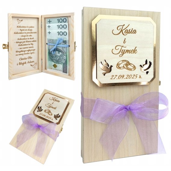To pudełeczko to doskonały sposób na wręczenie pieniędzy w oryginalnej, estetycznej formie. Zamiast zwykłej koperty – wyjątkowy prezent, który Para Młoda z przyjemnością zachowa na pamiątkę tego pięknego dnia.
