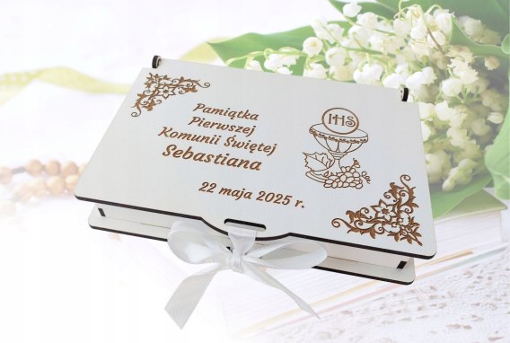 Szukasz wyjątkowego opakowania na prezent z okazji Pierwszej Komunii Świętej? Nasze eleganckie, białe pudełeczko z personalizowanym grawerem to doskonały wybór!