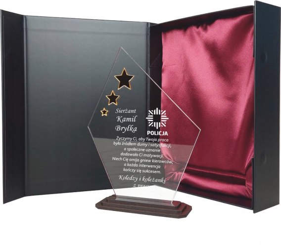 Wyjątkowa statuetka wykonana z przezroczystego szkła akrylowego osadzonego na podstawie w kolorze wenge z drewna HDF to idealny sposób, by wyrazić wdzięczność za służbę, odwagę i poświęcenie.