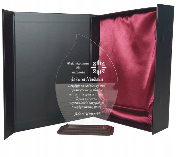Wyjątkowa statuetka wykonana z przezroczystego szkła akrylowego osadzonego na podstawie z płyty HDF w kolorze wenge to idealny sposób, by wyrazić wdzięczność za służbę, odwagę i poświęcenie.
