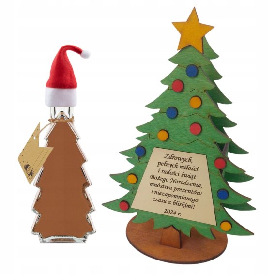 W samym sercu zestawu znajduje się butelka o pojemności 250 ml, ozdobiona małą czapeczką Świętego Mikołaja, która doskonale dopełnia bożonarodzeniową atmosferę. Całość zapakowana jest w oryginalne drewniane opakowanie w kształcie choinki, bejcowane na piękny, głęboki zielony kolor, który od razu przywołuje na myśl świąteczną zieleń. Wycięte laserowo bombki zdobią choinkę, a złota tabliczka z grawerem życzeń bożonarodzeniowych dodaje całości elegancji i wyjątkowego charakteru.